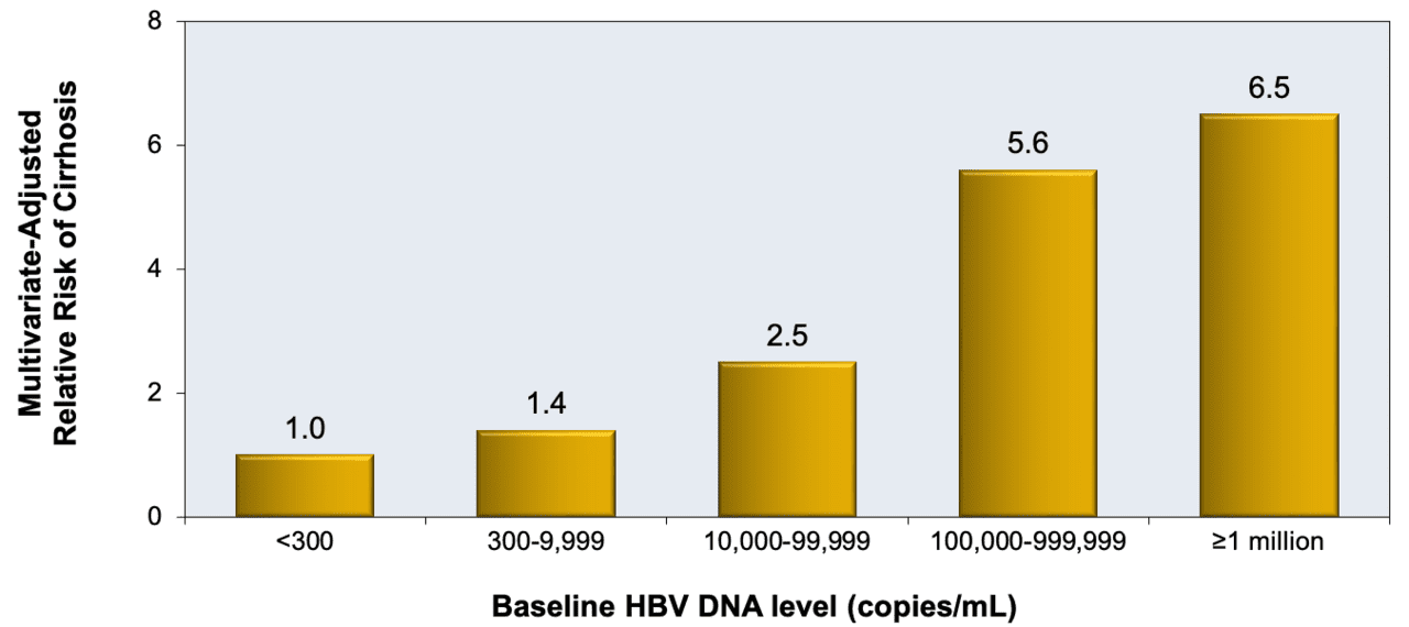 - In a separate but similar study, persons with chronic HBV were also found, in a dose-dependent gradient, to have an increased risk of cirrhosis with increasing serum HBV DNA levels, with a notable 6.5-fold higher risk in those with HBV DNA levels greater than 1 million copies/mL (approximately 200,000 IU/mL) compared to those with an HBV DNA level less than 300 copies/mL (less than approximately 60 IU/mL).[35]